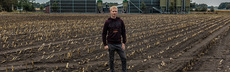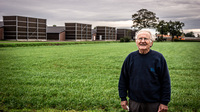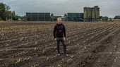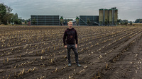 Boerendroom Bellens neemt ons mee naar het braakliggend terrein achter de twee kippenstallen. Daar moeten ze komen: twee extra stallen voor nog eens 118.000 kippen.