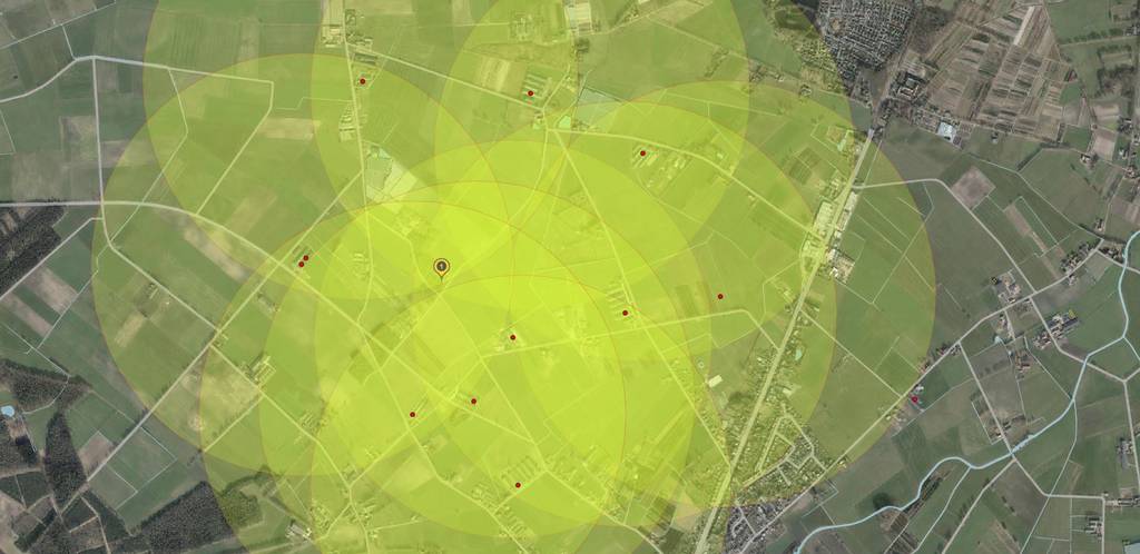 Fijnstof De rode stippen zijn pluimveebedrijven met meerdere stallen. Sinds 2007 kwamen er 28 exemplaren bij. Die liggen bijna allemaal binnen een straal van 1 km rond Roelands’ en Romijns woning. Dat is niet zonder risico.